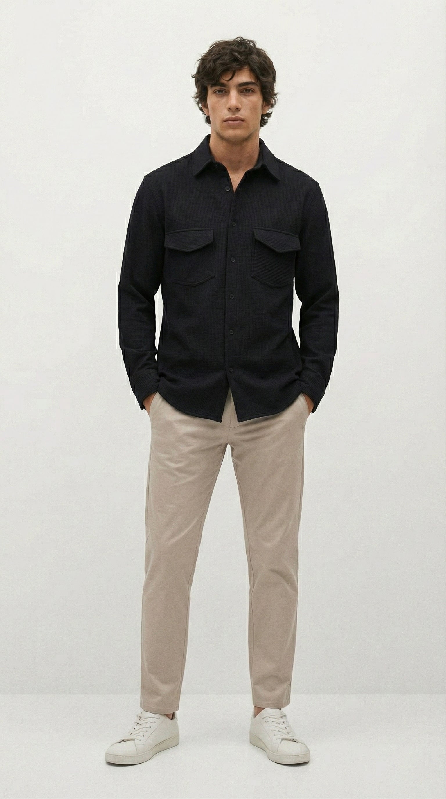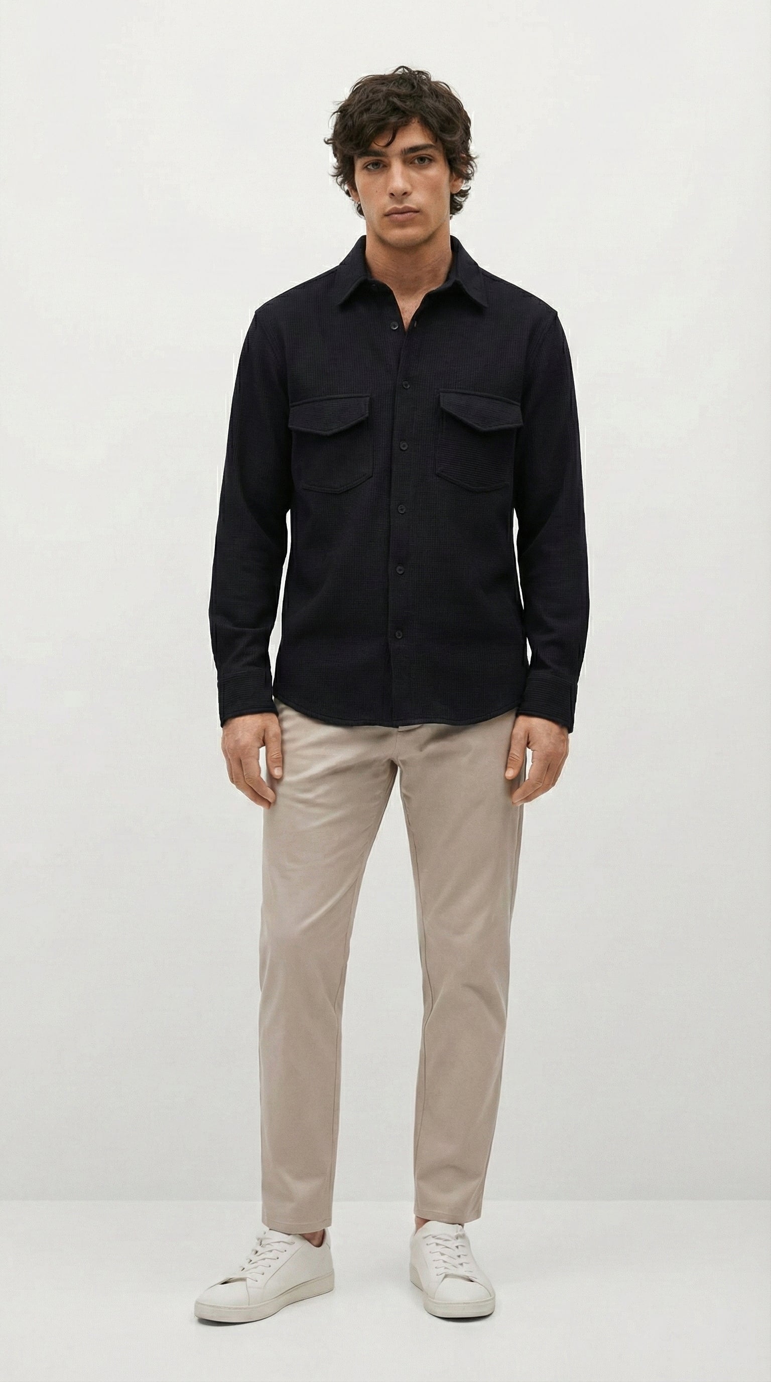 Black Color Double Side Patch Pocket Knitted Fabric Shirt