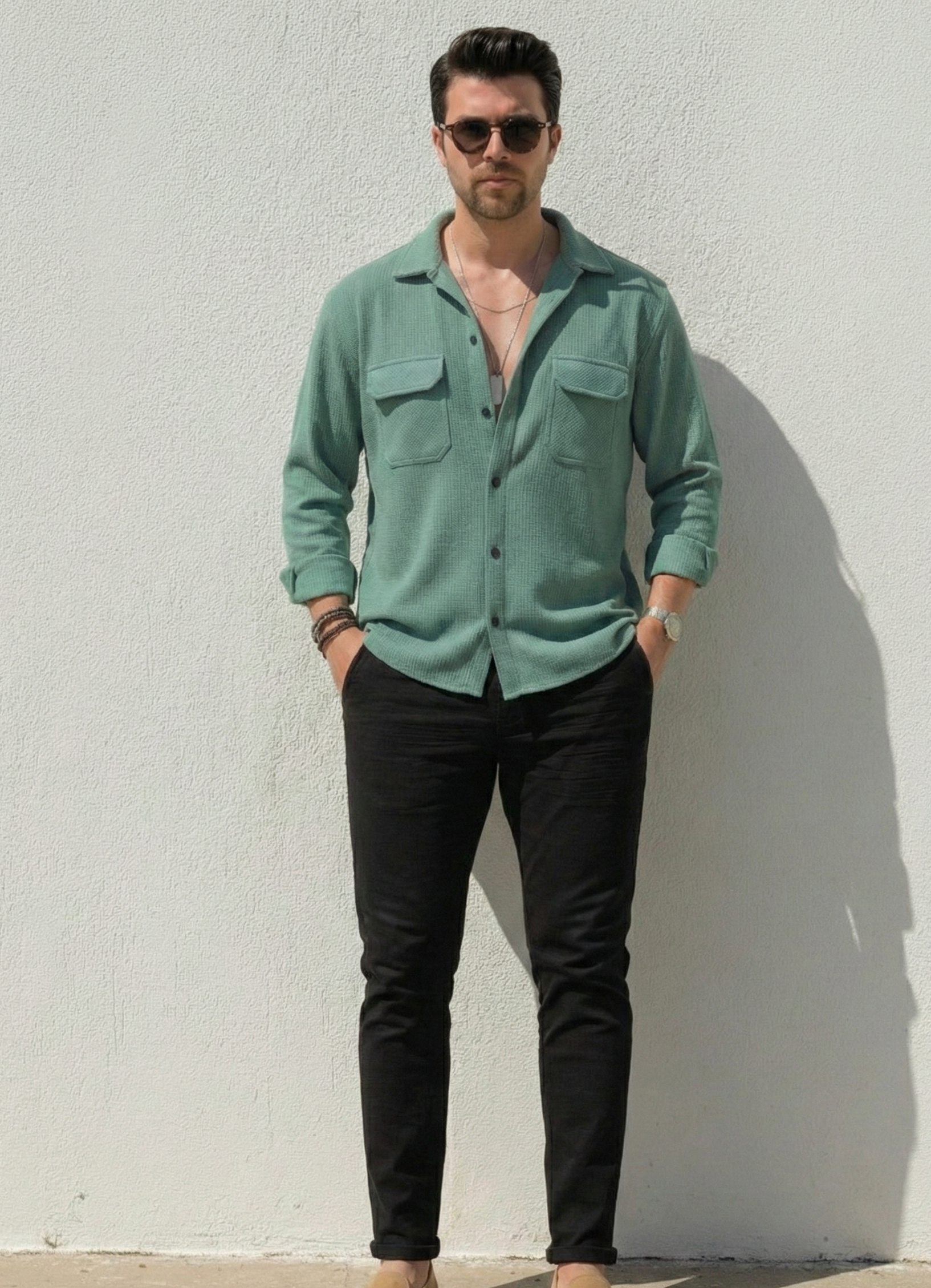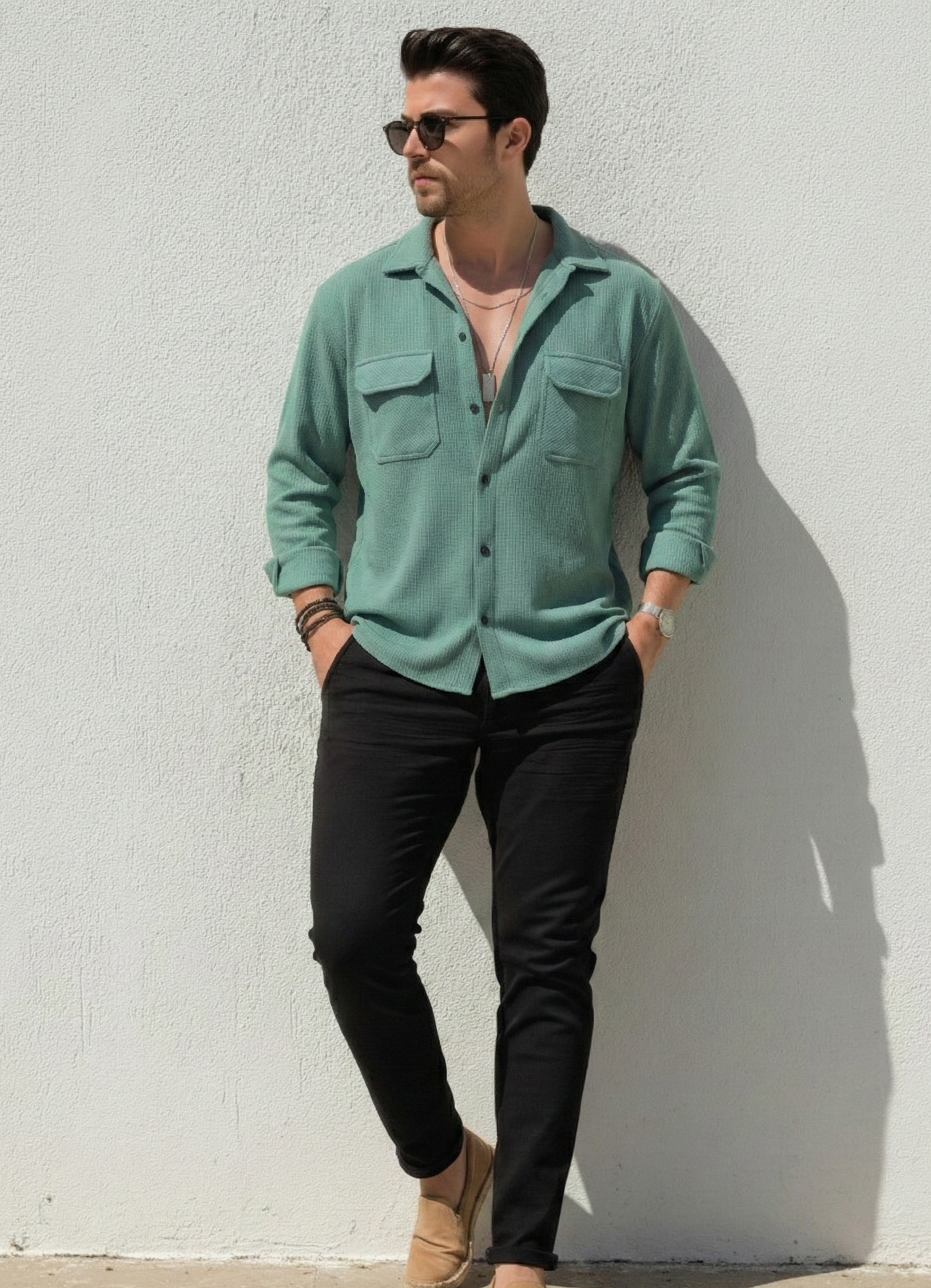 Sea Green Color Double Side Patch Pocket Knitted Fabric Shirt