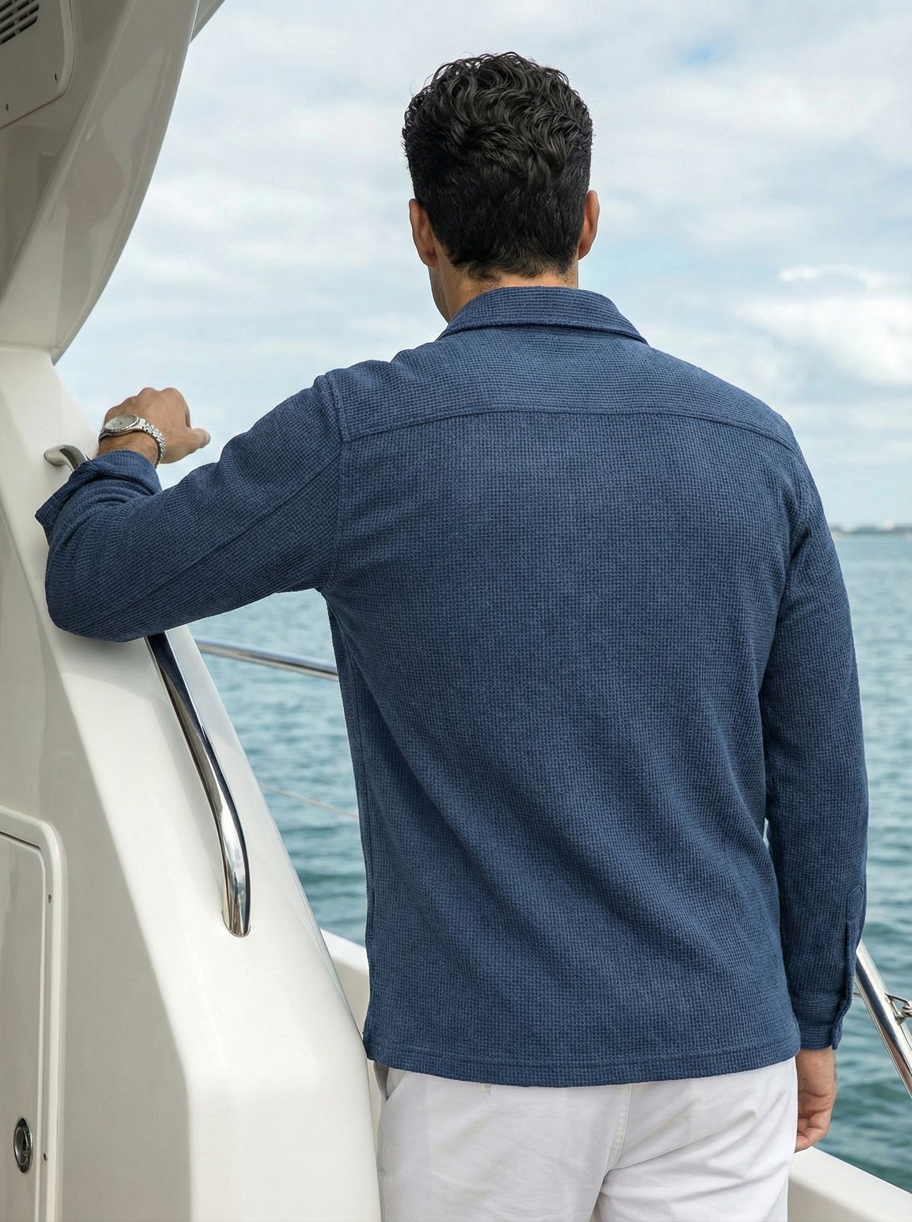 Dark Blue Color Double Side Patch Pocket Knitted Fabric Shirt
