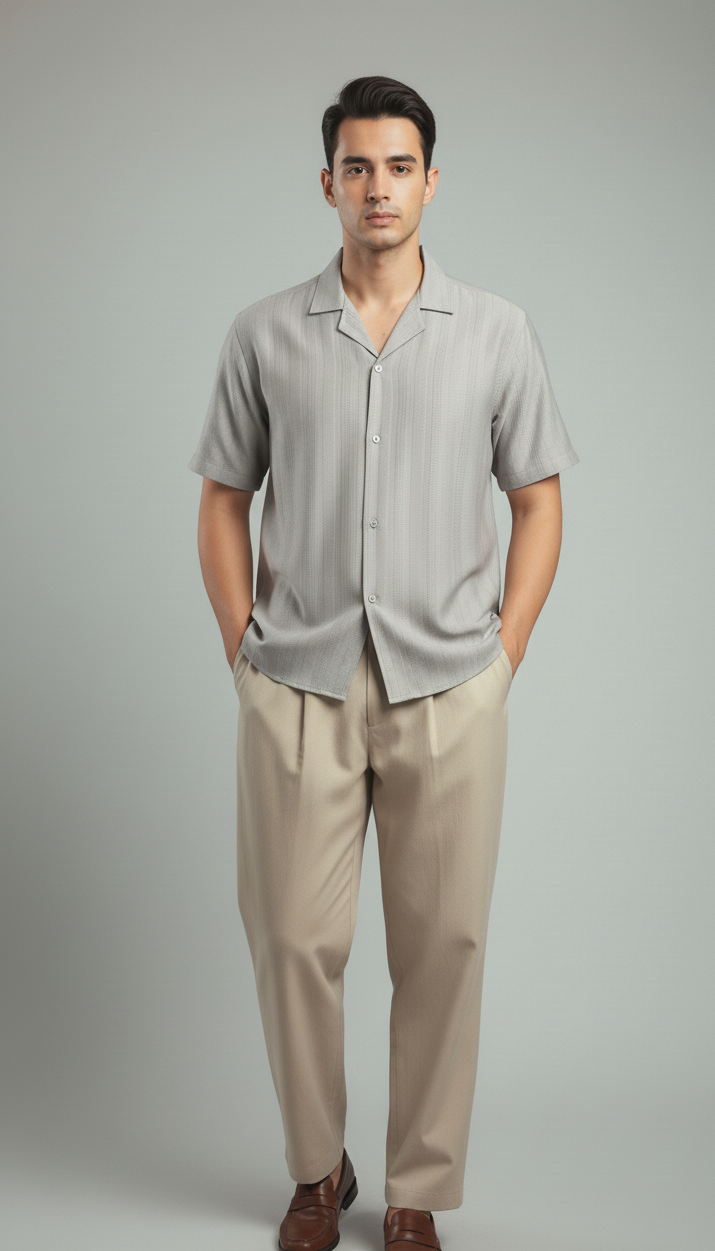 Half Sleeves Grey Color Striped Self Design Knitted Shirt