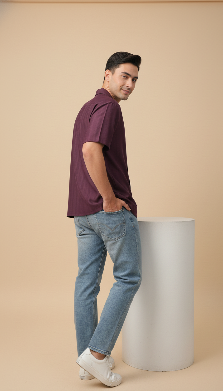 Half Sleeves Wine Color Striped Self Design Knitted Shirt