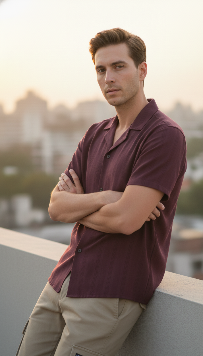 Half Sleeves Mauve Color Striped Self Design Knitted Shirt